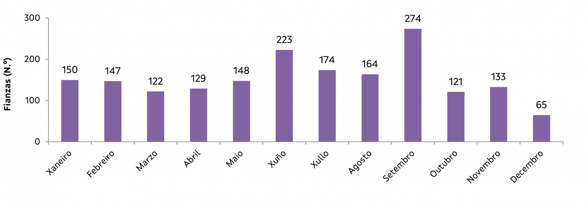Número de fianzas de los contratos firmados en 2025 en el municipio de Lugo por mes de contrato
