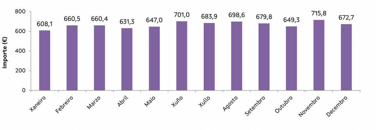 Importe medio da renda mensual dos contratos asinados en 2025 no concello de Pontevedra por mes de contrato