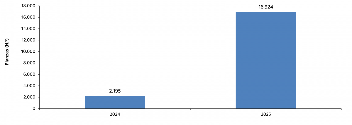 Número de fianzas depositadas en el año 2025 por año de contrato
