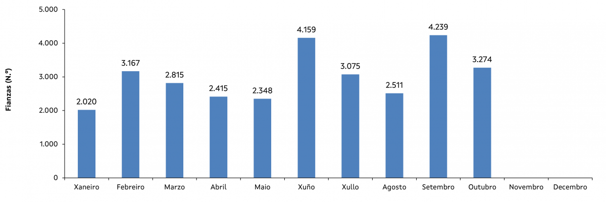 Número de fianzas depositadas en el año 2025 y de contrato en 2025 por mes de depósito