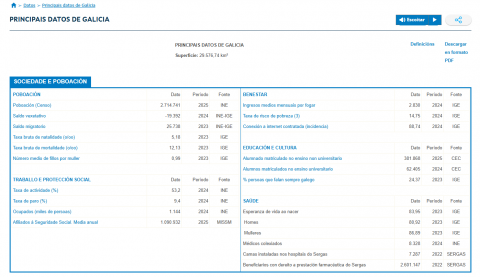 La página de Principales Datos de Galicia del Instituto Gallego de Estadística (IGE) recopila información estadística actualizada sobre la sociedad, la economía, el territorio y el bienestar de la comunidad, ofreciendo una visión global de la situación de nuestra región. Esta información permite conocer tanto la composición y evolución de la población, el mercado laboral, la educación y la salud, como los principales indicadores económicos, productivos y empresariales.