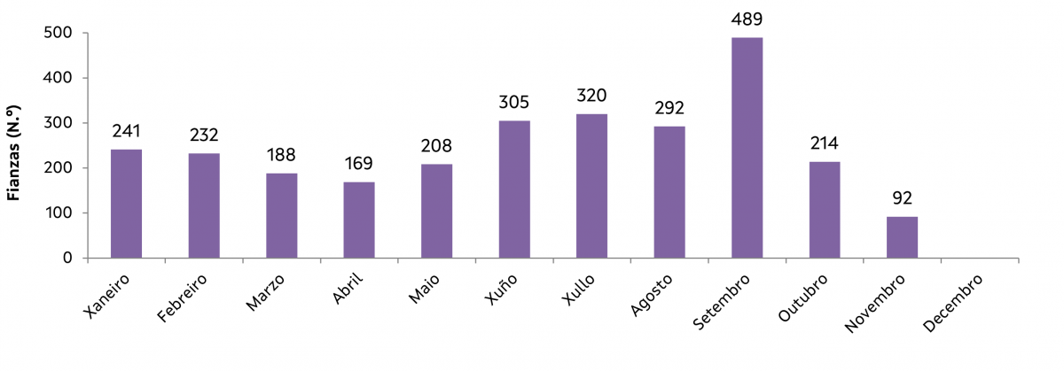 Nota: Como os valores de mes de contrato e mes de depósito non sempre coinciden (por exemplo, nas fianzas depositadas no mes de novembro poden aparecer contratos de outubro, setembro etc.), os resultados relativos aos contratos formalizados por mes e ano son sempre susceptibles de actualización.