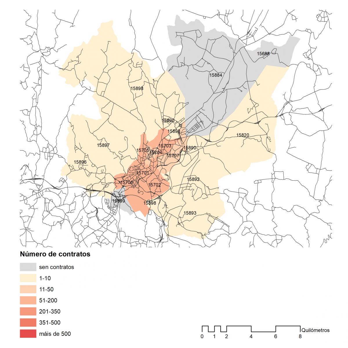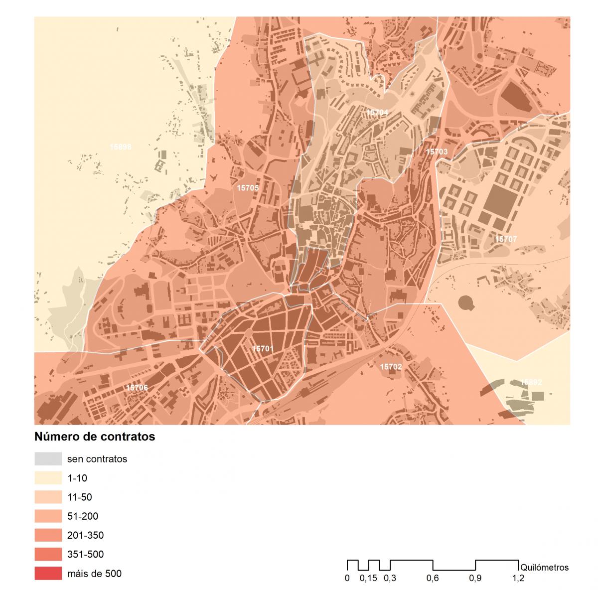 Número dos contratos asinados en 2019 no concello de Santiago por códigos postais