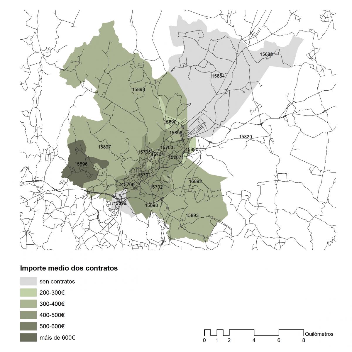 Importe medio dos contratos asinados en 2019 no concello de Santiago por códigos postais