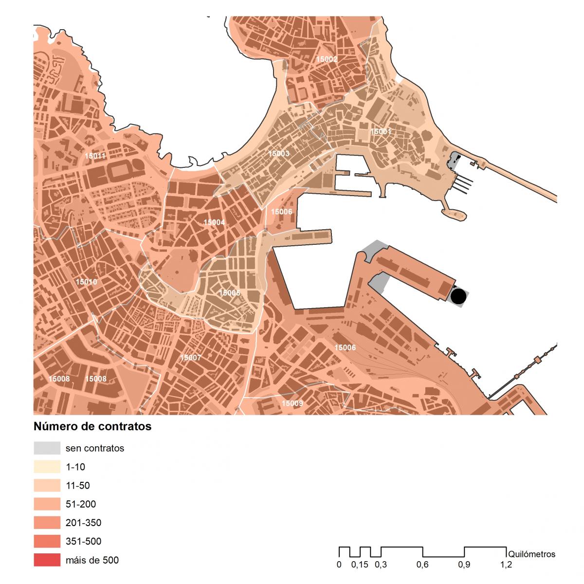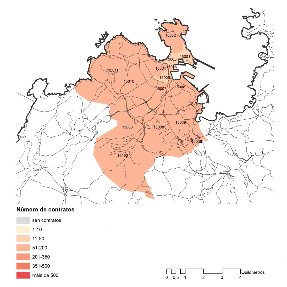 Número dos contratos asinados en 2019 no concello de A Coruña por códigos postais