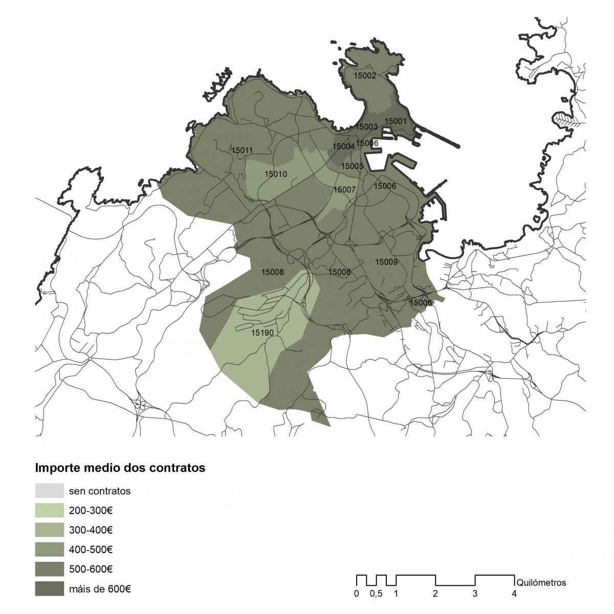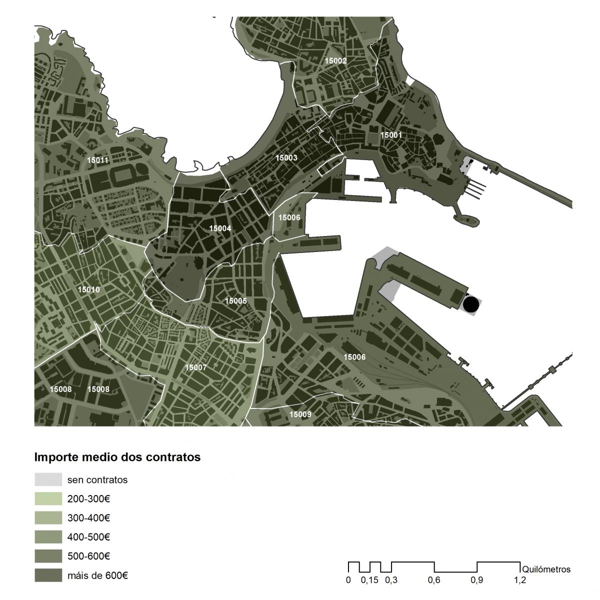 Importe medio dos contratos asinados en 2019 no concello de A Coruña por códigos postais