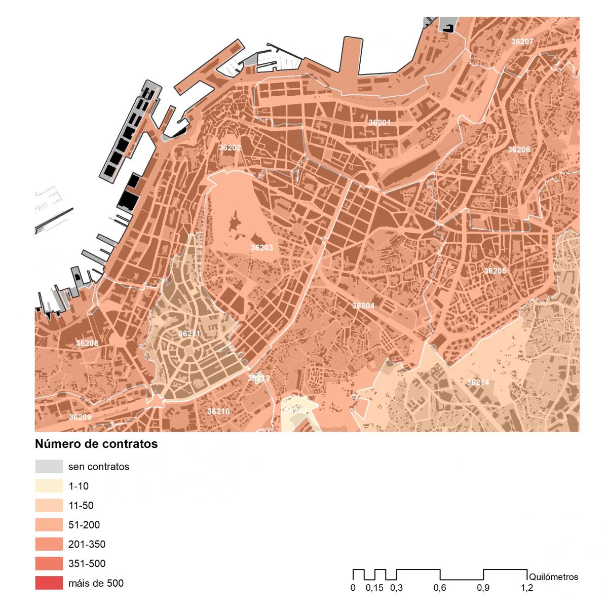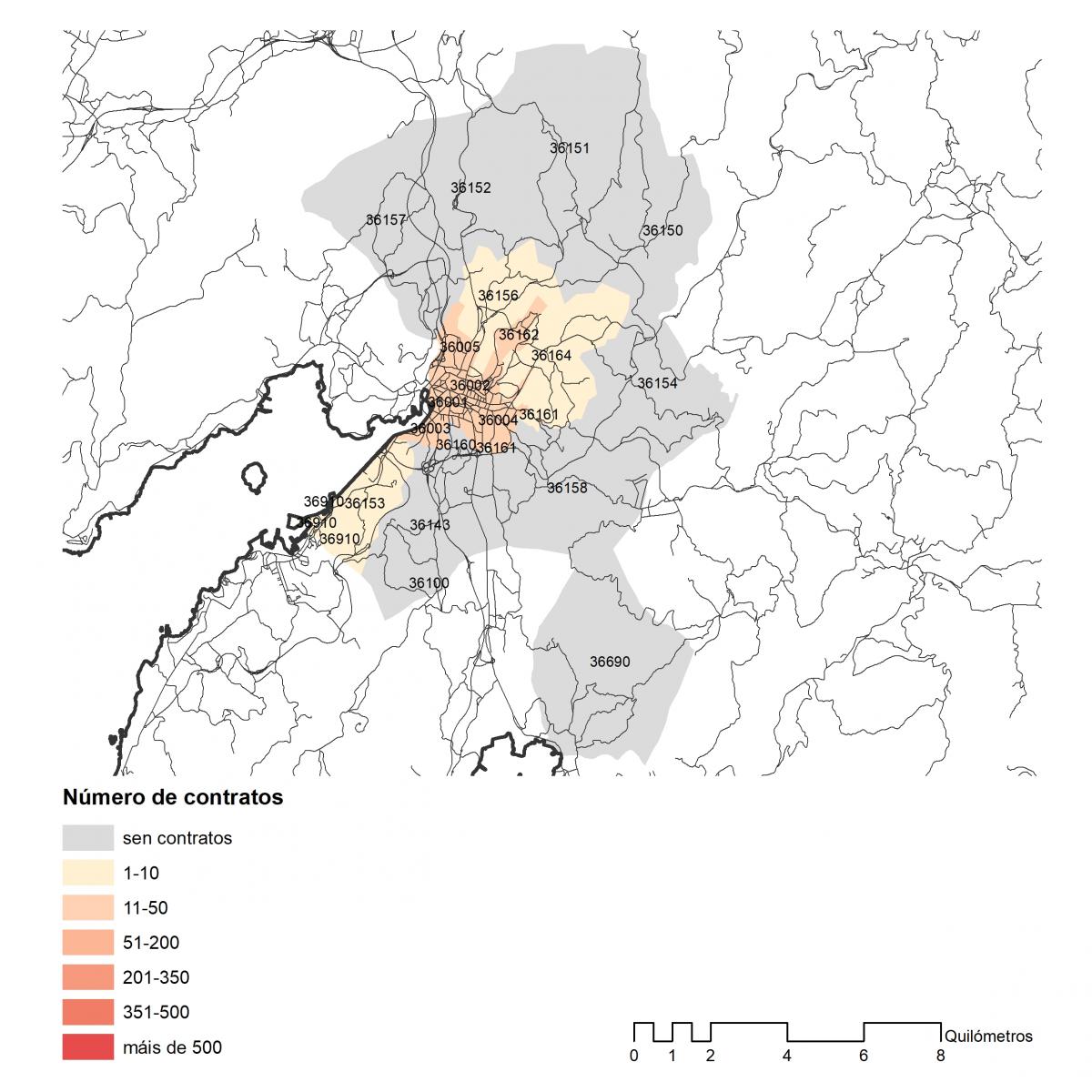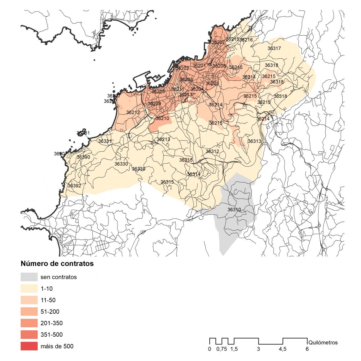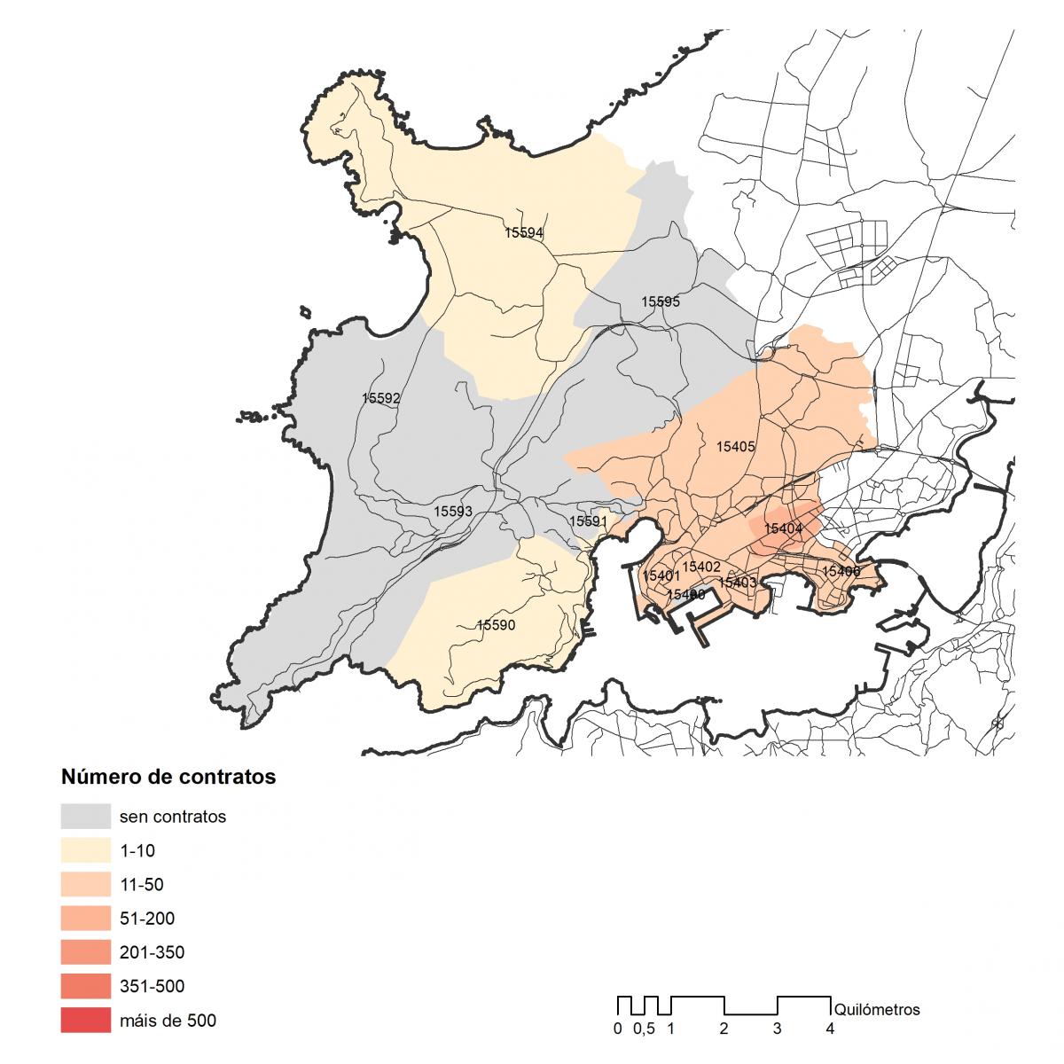Número dos contratos asinados en 2019 no concello de Vigo por códigos postais