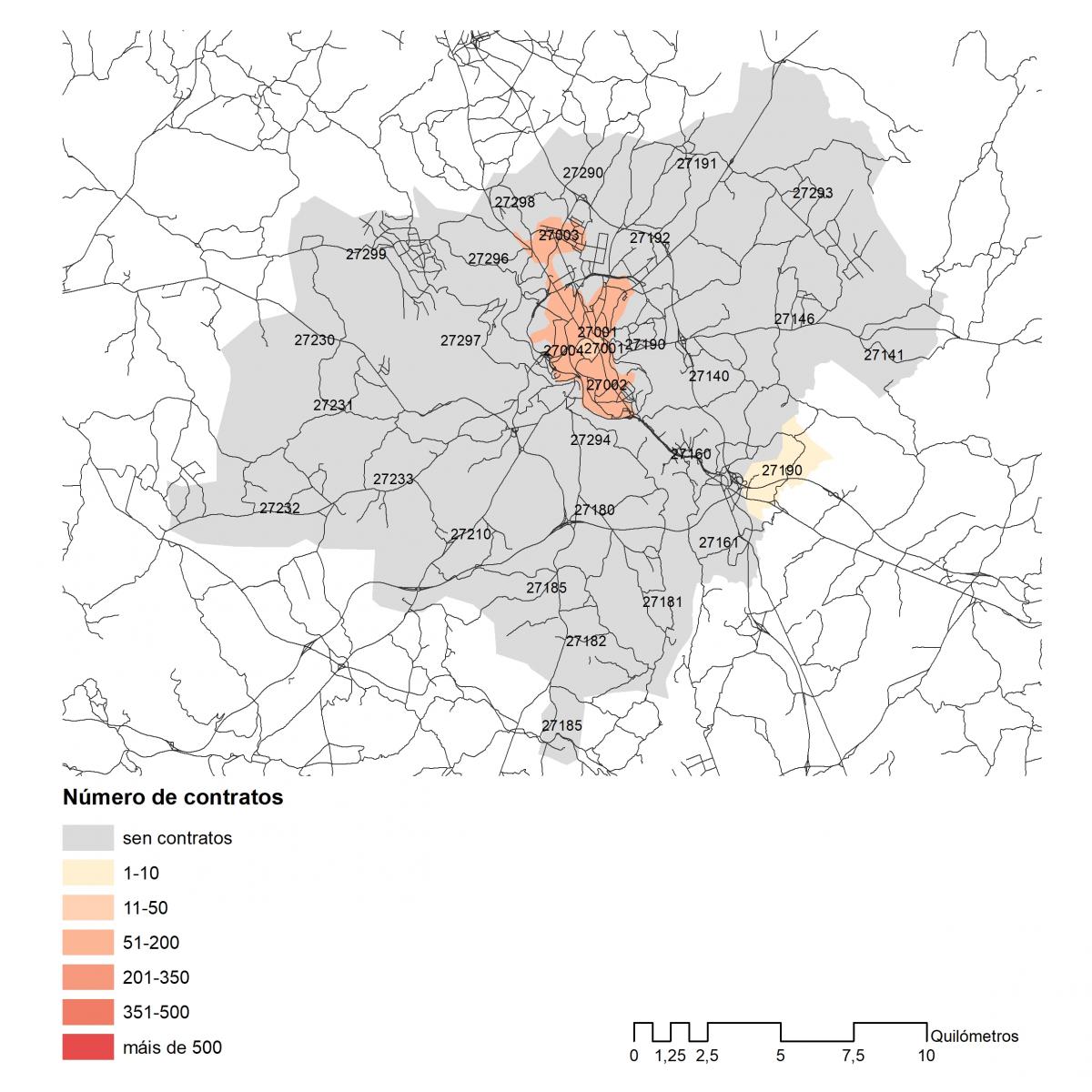 Número dos contratos asinados en 2019 no concello de Lugo por códigos postais