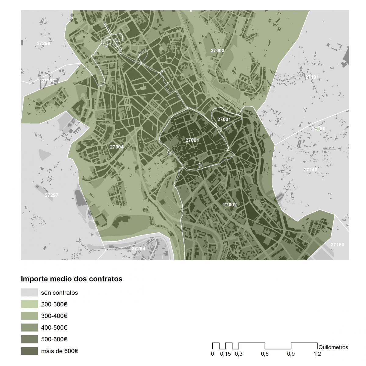 Importe medio dos contratos asinados en 2019 no concello de Lugo por códigos postais