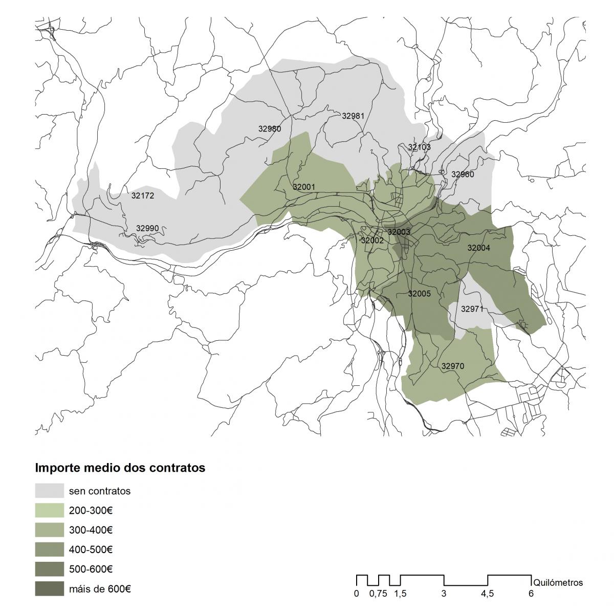 Importe medio dos contratos asinados en 2019 no concello de Ourense por códigos postais