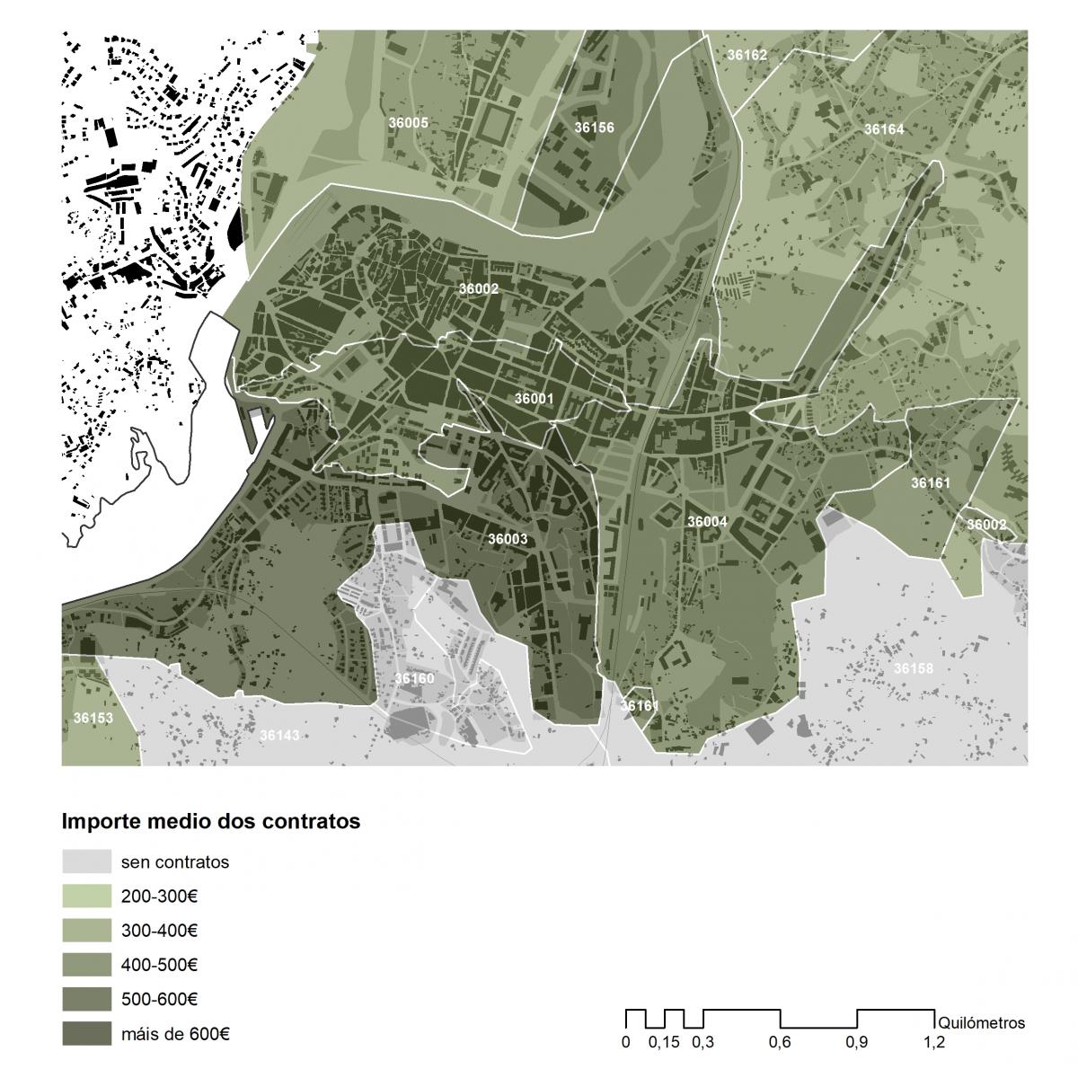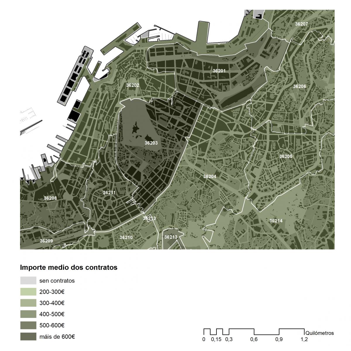 Importe medio dos contratos asinados en 2019 no concello de Vigo por códigos postais