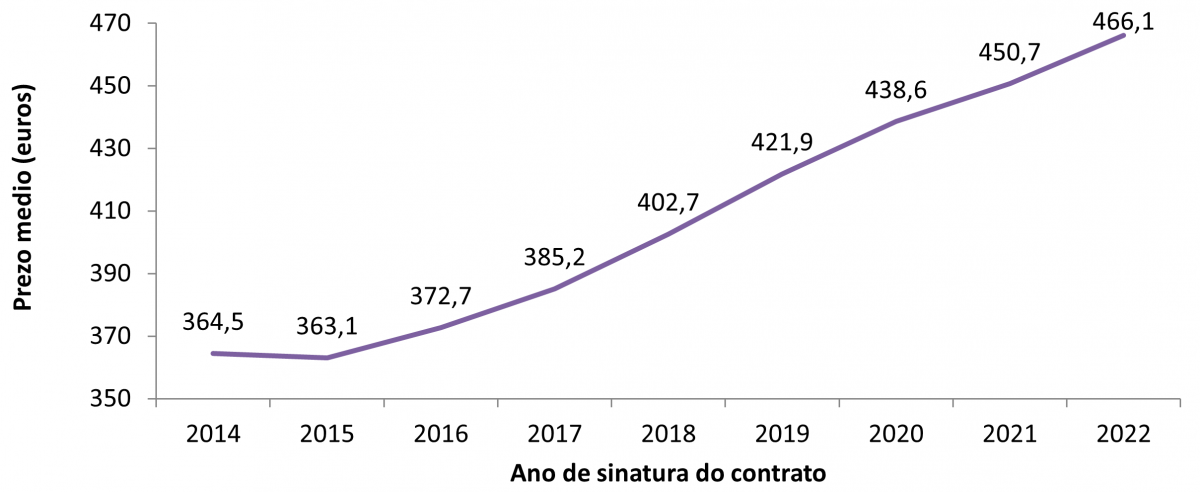 Importe medio da renda mensual por ano de contrato