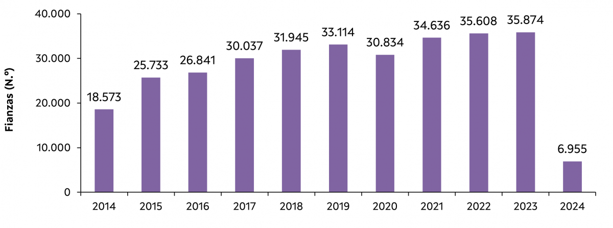 Fianzas por data de contrato. Número e importe medio dos contratos | Marzo 2024