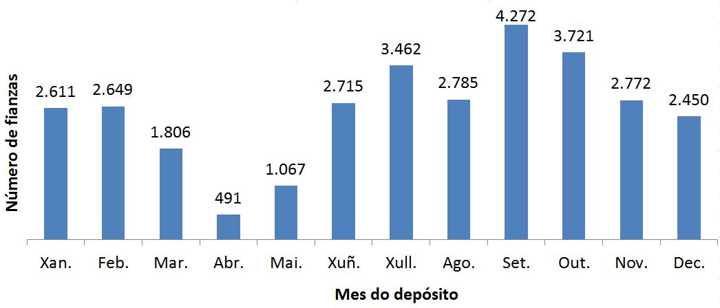 Número de fianzas depositadas no ano 2020 por mes do depósito