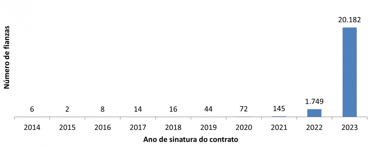 Número de fianzas depositadas no ano 2023 por ano de contrato
