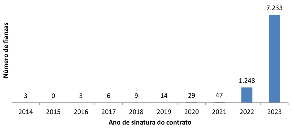 Número de fianzas depositadas no ano 2023 por ano de contrato