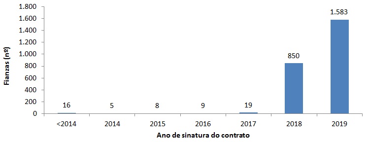 Número de fianzas depositadas no ano 2019 por ano de contrato