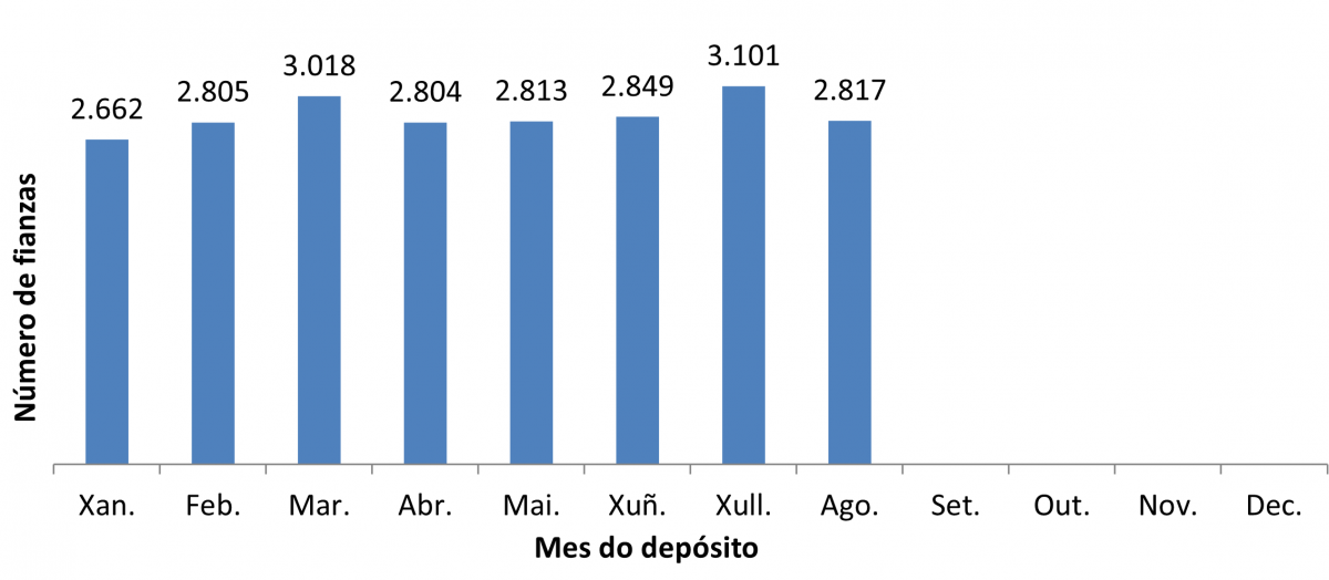 Ano do depósito Mes do depósito Nº fianzas no mes Acumulado no ano Variación respecto do mes anterior Variación sobre o mesmo mes do ano anterior Importe medio (€)