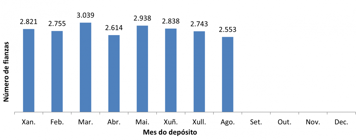 Ano do depósito Mes do depósito Nº fianzas no mes Acumulado no ano Variación respecto do mes anterior Variación sobre o mesmo mes do ano anterior Importe medio (€)