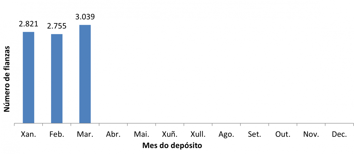 Número de fianzas depositadas no ano 2023 por mes do depósito