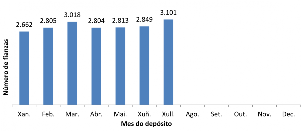 Ano do depósito Mes do depósito Nº fianzas no mes Acumulado no ano Variación respecto do mes anterior Variación sobre o mesmo mes do ano anterior Importe medio (€)